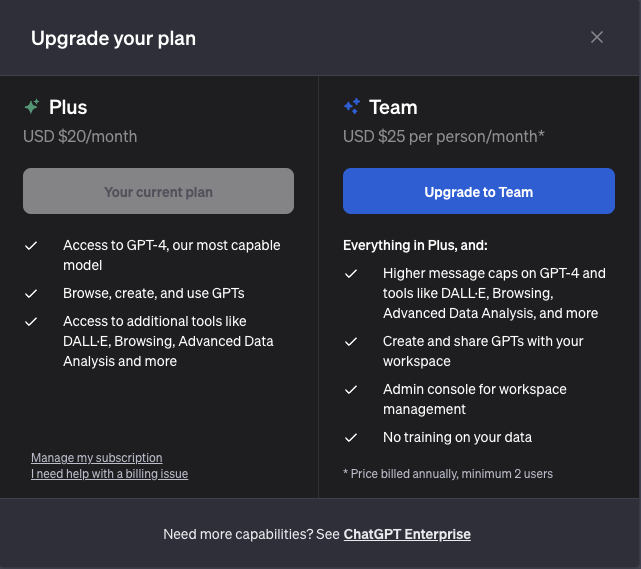 팀 plan에 더 자세히 알고 싶다면, https://openai.com/chatgpt/team 에서 확인하세요